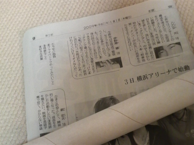 それから今日は寒い! 寒い中頑張ってツタヤに返しにいったのに…なんと今日は半額で…つられて借りちゃったじゃん!(何につられたのか。半額ね!) 急にじぶりが見たくなって〜〜 耳をすませばとラピュタ借りてしまいました。 わたしのベスト3に入るジブリ作品です 気持ちが落ち着くは、とくに耳をすませばとかね〜〜 それから駐在さんの700日戦争と嫌われ松子の計4本を借りちゃいました。 駐在さんは…しょーもない悪戯がおもしろかった〜〜(笑) っていうか本編の途中にファンモンの曲が掛かったのが意外にピッタリでなんだか感動。 ファンモンっていったらMステの時にファンモンの曲紹介でゆやぶがふざけてた記憶しかないんですけど(残念なゆや担) それに麻生久美子出てたしね。麻生久美子だいすきだからさっ だって可愛いんだもん〜〜 嫌われ松子は大阪から帰ってきたらしっかり見よう。 っていうか明日のテスト勉強しなきゃいけないんだけど〜何やってんだろ〜〜 でも今日はそろそろ寝なくちゃっ 最近夜更かしばっかりでまた肌荒れちゃいました。 うーん、治んないかな〜〜 今3日の横アリのMCのレポをポチポチしております。 3日はぐだぐだだったもんな〜〜(笑) 「俺のターン」とかね…これって3日だったよね? 遊戯王って今の子わかんないでしょ、薮ちゃん。 時代時代。(笑) 読売新聞の1日付けのを親が送ってくれました。 ご丁寧にこんな筒にまで入れてくれて。 オタ心理わかってる~~ 1人1人のインタビューの上には目の部分の写真をズームで。 よりによってゆやが自分で一番嫌いな部分を… それに大ちゃんがびみょーに半目なんだよね… この写真使ってあげなくてもよかったのに~~ 大ちゃんちょっと残念。 1、2、3、4と質問があるんだけれど圭人と涼介と裕翔に3の答えがないのはなぜ?? 1、今年の抱負 今年のたかきゆうやさんは初心者忘れるべからずで頑張るそうです。 ファッションショーやモデルまやってみたいとか! わかってる~~! だってスタイルがチャームポイントなゆやだもんね~! モデルとか絶対良いと思うんだけど、わたしとしては^^ 上里くんに続いてFINE BOYSの専属モデルとかになっちゃえば良いのに! 2プライベートでやってみたいこと は、洋服の着こなしがうまくなりたいとか。 もう十分おしゃれだと思うんだけどな~ いつかゆやが着てたパーカーすっごい可愛かったんだけどな。 この写真で着てるパーカーもかなり可愛いし!まあこれは衣装か~ 3、得意なこと で、特技を今年に見つけたいそうで。 でも今ギターしてるんだよね?? 薮ちゃんに教わってうまくなっちゃえばいいじゃんね! それからギターデュオとかしちゃえばいいのに~~ でもそこまでになるのには結構練習しなきゃだよね~ 4、好きな言葉は、 「夢」だそうで。 今の夢はドームでコンサートをすること。 初めてドームでしたときはデビューのご褒美って言ってたもんね。 ちゃんと自分たちの力でドームでコンサートできるようになりたい!って言ってたもんね~ゆや^^ 普通にそろそろドームでできそうなのはこっちとしては不安なんだけどね~~ もう少し、ちっちゃいとこでしてほしいです(笑) しかしこの写真のゆやの髪型とかとくに涼介の髪型とか、何かで見たことあるな~ なんかの雑誌のときの撮りと一緒だったのかな? はあ~なんかキてるなあ~平成ジャンプ。 見出しが「平成生まれ跳ねる!」だよ~~ 私も平成生まれ… 跳ねなきゃな~~ |